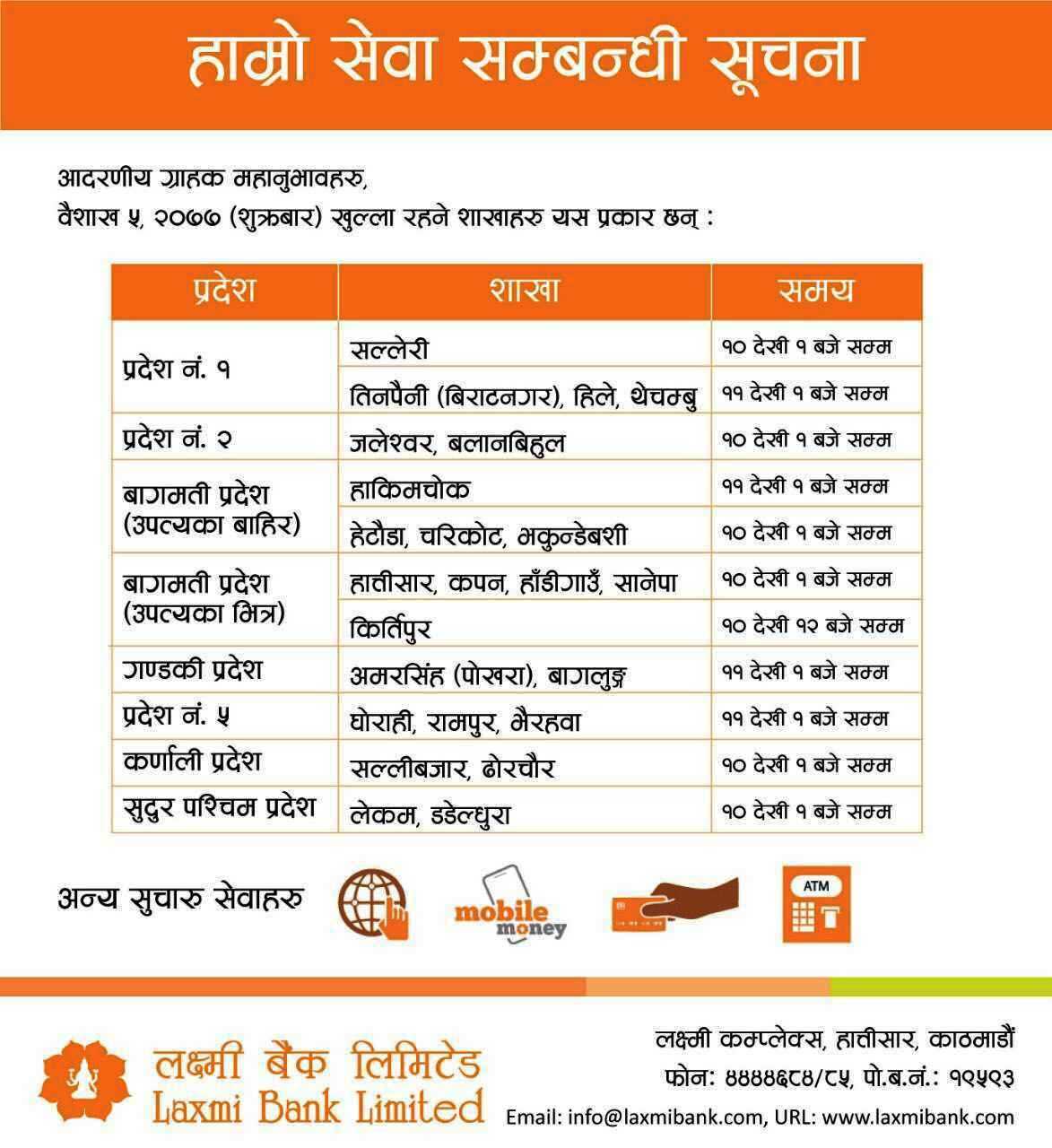 आज लक्ष्मी बैंकले यी शाखा मार्फत सेवा दिने