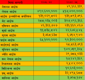 त्यस्तै आइएमइ लाईफ इन्स्योरेन्सले २ करोड ८८ लाख रुपैयाँ एकल भुक्तानी बीमाशुल्क संकलन आर्जन गरेको छ। त्यसैगरी सिटिजन्स लाईफ इन्स्योरेन्स कम्पनीले १ करोड ६ लाख रुपैयाँ एकल भुक्तानी बीमाशुल्क संकलन गरेको छ ।नयाँ जिबन बीमा कम्पनीहरु मध्ये सानिमा लाईफ इन्स्योरेन्सले सबैभन्दा कम ३७ लाख ८ हजार मात्र एकल बीमाशुल्क आर्जन गरेको छ।
