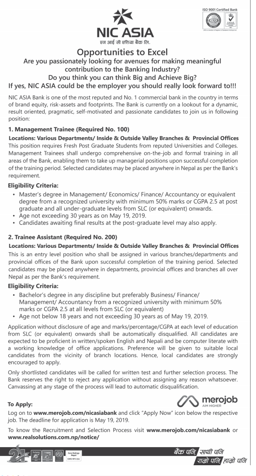एनआईसी एशिया बैंकले विभिन्न पदमा ठुलो संख्यामा कर्मचारी मागेको छ । बैंकले एक सूचना जारी गर्दै ३०० जना कर्मचारी माग गरेको हो ।