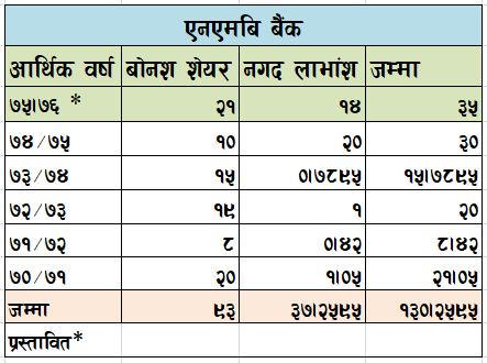 एनएमबि बैंकले ओम डेभलपमेन्ट बैंकलाई प्राप्ती गरी असोज ११ गतेबाट एकिकृत कारोबार गरेका थिए । त्यसकारण यो लाभांश तात्कालीन ओम डेभलपमेन्ट बैंकका शेयरधनीले समेत पाउने छन्।