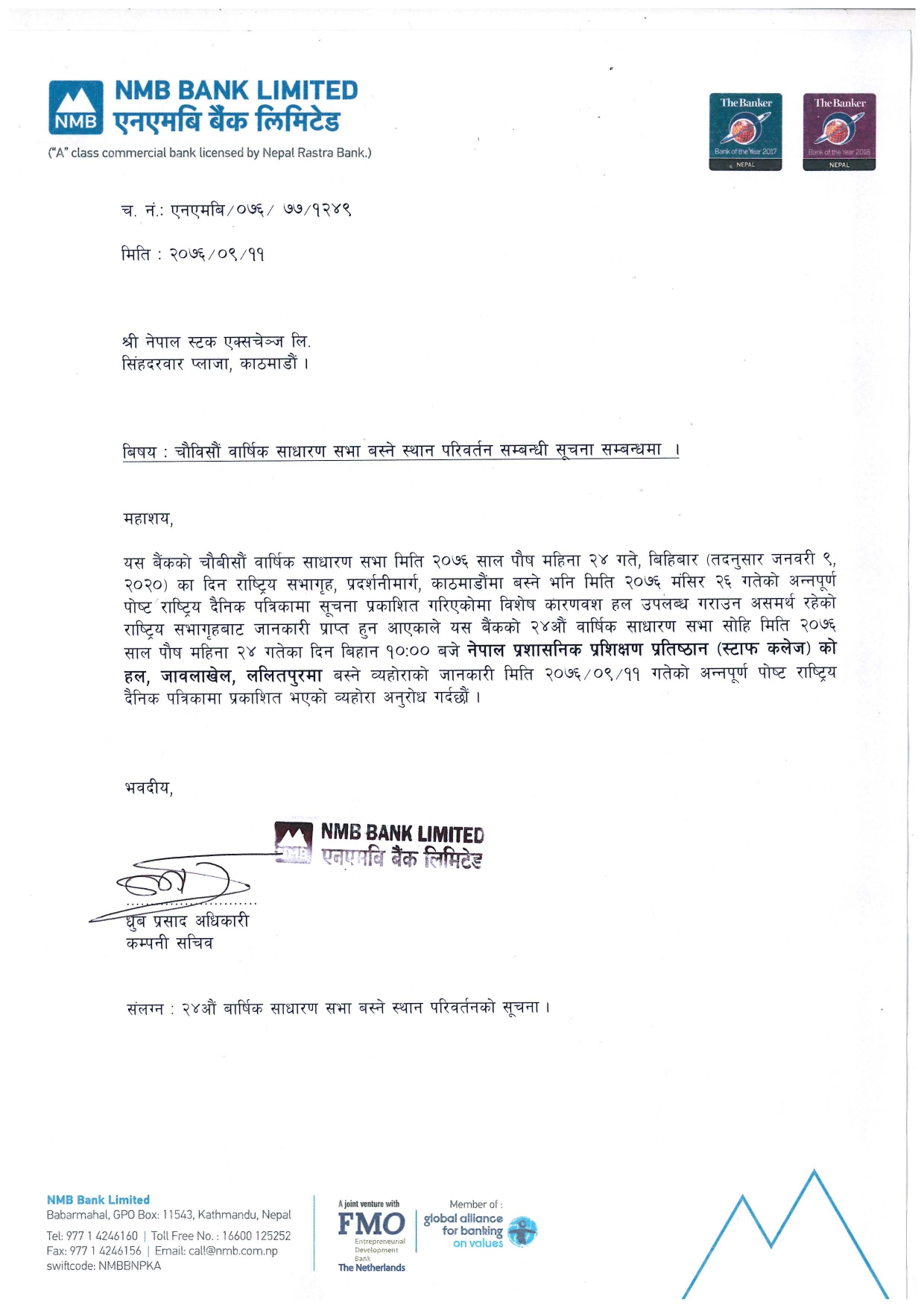 काठमाडौं । एनएमबि बैंकको वार्षिक साधारण सभा बस्ने ठाँउ परिवर्तन भएको छ । यसअघि बैंकले राष्ट्रिय सभागृह, प्रदर्शनीमार्ग ,काठमाडौंमा साधारण सभा गर्ने बताएको थियो । राष्ट्रिय सभा गृहले हल उपलब्ध गराउन नसक्ने जानकारी गराएपछि साधारण्ण सभा बस्ने ठाउँ परिवर्तन गरेको बैंकले जनाएको छ ।