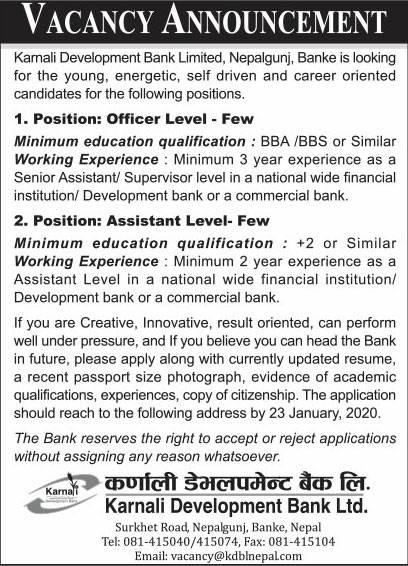 काठमाडौं । कर्णाली डेभलपमेन्ट बैंकले विभिन्न पदका लागि कर्मचारीको माग गरेको छ । बैंकले अफिसर लेभलका लागि केही र असिस्टेन्ट लेभलका लागि केही संख्यामा कर्मचारीको माग गरेको जनाएको छ । बैंकले विभिन्न शाखा कार्यालयका लागि कर्मचारीको माग गरेको जनाएको छ ।