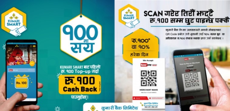 कुमारी बैंकको १ सय मा १ सय अन्तर्गत कुमारी बैंकका ग्राहकले कुमारी मोबाईल बैंकिङबाट पहिलो १ सय रुपैयाँको टपअप गर्दा रु १ सय रुपैयाँ क्यासब्याक प्रप्त गर्न सक्नेछन् ।