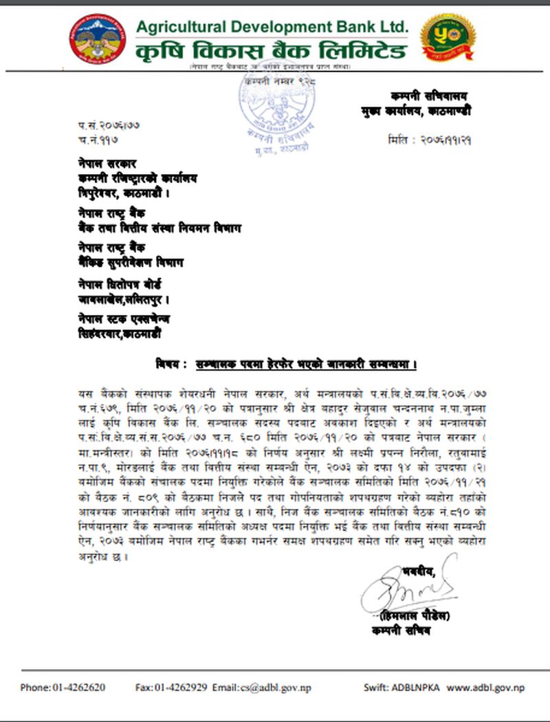 काठमाडौं । कृषि विकास बैंकको अध्यक्षमा लक्ष्मीप्रपन्न निरौला नियुक्त भएका छन् । नेपाल राष्ट्र बैंकका पूर्व प्रवक्ता तथा कार्यकारी निर्देशक समेत भइसकेका निरौलालाई आज नेपाल राष्ट्र बैंकका गभर्नर चिरञ्जिवी नेपालले पद तथा गोपनियताको शपथ ग्रहण गराएका छन् ।