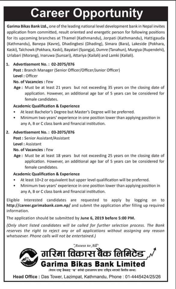 स्नातक उतीर्ण गरी दुई वर्षको अनुभव हासिल गरेका व्यक्तिले ब्रान्च मेनेजरका लागि आवेदन दिन सक्नेछन् भने एसिस्टेन्टका लागि २ उतीर्ण दुई वर्षको अनुभव भएको हुनुपर्नेछ । आवेदन दिने म्याद ६ जुनसम्म रहेको छ ।