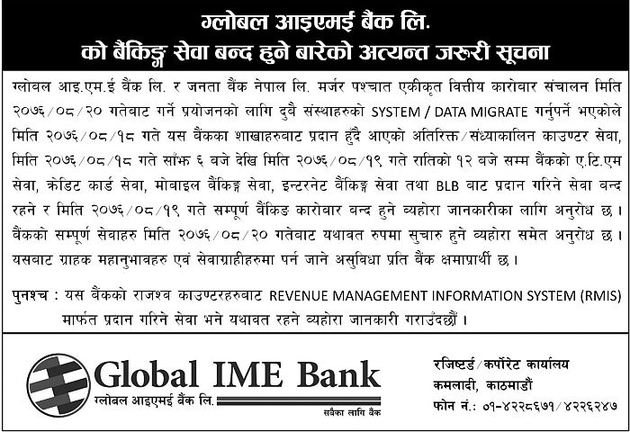 ग्लोबल र जनता बैंकको एकिकृत कारोबार मंसिर २० देखि, आज साँझेदेखि दुबै बैंकको बैंकिङ कारोबार बन्द