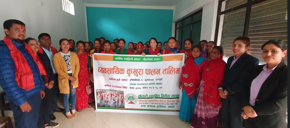 रुपन्देही । चौतारी लघुवित्त वित्तीय सँस्थाको शाखा कार्यालय ठुठि पिपलले रुपन्देहीले आफ्ना ग्राहक सदस्यहरुलाई सिपमूलक तालित दिएको छ । संस्थाले शाखाकार्यालय ठुठिपिपल,रुपन्देहीमा आबद्ध सदस्यहरुमध्ये ४०.जनालाई निशुल्क रुपमा कुखुरापालन तालिम दिइएको जनाएको छ ।