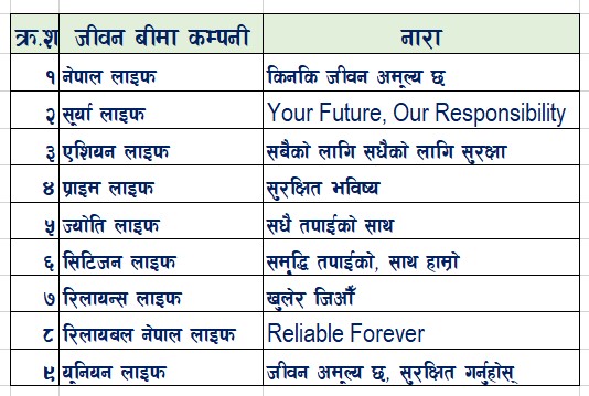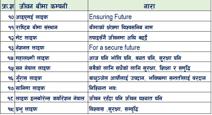 यसैगरी, ज्योति लाइफ इन्स्योरेन्सको ‘सधै तपाईको साथ’, सिटिजन लाइफ इन्स्योरेन्सको ‘समृद्धि तपाईको साथ हाम्रो’, रिलायन्स लाइफ इन्स्योरेन्सको ‘खुलेर जिऔँ’, रिलाबल नेपाल लाइफको ‘Reliable Forever‘, यूनियन लाइफ इन्स्योरेन्सको ‘ जीवन अमूल्य छ सुरक्षित गर्नुहोस्’ नारा प्रयोग गर्दै आएका छन् ।