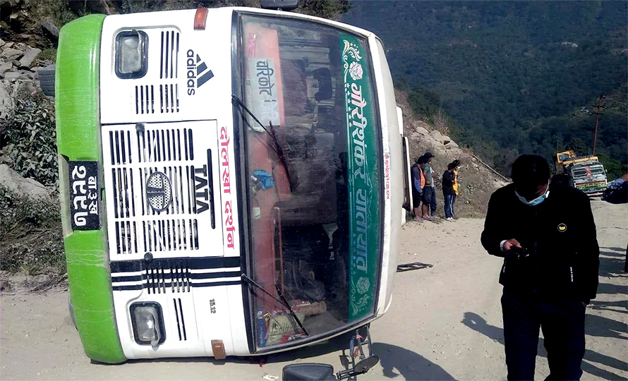 काठमाडौं । काठमाडौं आउँदै गरेको गौरीशंकर यातायातको बस आज विहान दोलखामा पल्टिँदा एक जना घाइते भएका छन् । दोलखाको गैरीमुदीबाट काठमाडौंका लागि छुटेको बा३ख २९९७ नम्बरको बस चरंगे भन्ने स्थानमा सडकमै पल्टिएर दुर्घटनामा परेको हा ।