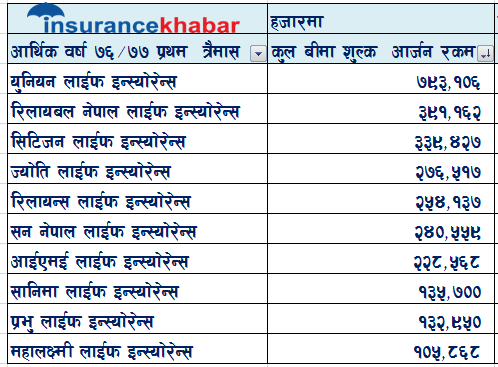१० नयाँ जीवन बीमा कम्पनीमध्ये सबैभन्दा धेरै बीमा शुल्क आर्जन गर्नेमा यूनियन लाइफ इन्स्योरेन्स कम्पनी लिमिटेड पर्दछ। यूनियन लाइफले आर्थिक वर्षको प्रथम त्रैमासमा ७९ करोड ३१ लाख रुपैयाँ कुल बीमा शुल्क आर्जन गरेको छ भने सबैभन्दा थोरै कुल बीमा शुल्क आर्जन गर्नेमा महालक्ष्मी लाइफ इन्स्योरेन्स पर्दछ। महालक्ष्मी लाइफले १० करोड ५८ लाख रुपैयाँ कुल बीमा शुल्क आर्जन गरेको छ।