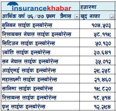 १० नयाँ जीवन बीमा कम्पनीहरुमध्ये सबैभन्दा धेरै खुद नाफा गर्ने जीवन बीमा कम्पनीमा यूनियन लाइफ इन्स्योरेन्स कम्पनी पर्छ। कम्पनीले प्रथम त्रैमाससम्म १० करोड ४५ लाख रुपैयाँ खुद नाफा गरेको छ त्यस्तै सबैभन्दा थोरै खुद नाफा गर्ने कम्पनी भनेको प्रभु लाइफ इन्स्योरेन्स रहेको छ। प्रभु लाइफले १ करोड २२ लाख खुद नाफा गरेको छ।