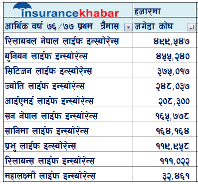 १० नयाँ जीवन बीमा कम्पनीहरुमध्ये रिलायबल नेपाल लाइफ इन्स्योरेन्स कम्पनी लिमिटेडको जगेडा कोष बलियो छ। रिलायबल नेपाल लाइफको जगेडा कोषमा अहिले ४९ करोड ९५ लाख रुपैयाँ रहेको छ। त्यस्तै महालक्ष्मी लाइफ इन्स्योरेन्सको जगेडा कोष सबै भन्दा थोरै छ। कोषमा अहिले ३ करोड २४ लाख रुपैयाँ संचित छ।