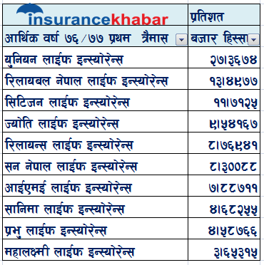 १० नयाँ जीवन बीमा कम्पनीहरुले चालु आर्थिक वर्षको प्रथम त्रैमासमा २ अर्ब ८९ करोड कुल बीमा शुल्क आर्जन गरेकोमा यूनियन लाईफ इन्स्योरेन्सको बजार हिस्सा सबै भन्दा धेरै २७ प्रतिशत रहेको छ भने महालक्ष्मी लाईफ इन्स्योरेन्सको बजार हिस्सा निकै थोरै रहेको छ।