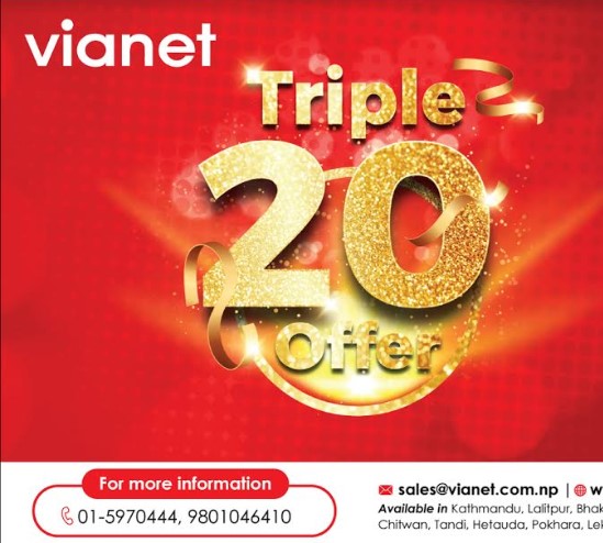 नयाँ वर्षको सुमधुर सुरुवात गर्नका लागि भायानेटले ग्राहकहरु लागि २० एमबिपीएसको नयाँ इन्टरनेट प्लान ल्याएको हो । यो नयाँ इन्ट्री–लेबलको प्लान सीमित अवधिका लागि वार्षिक रु. ११,४०० मा उपलब्ध छ ।