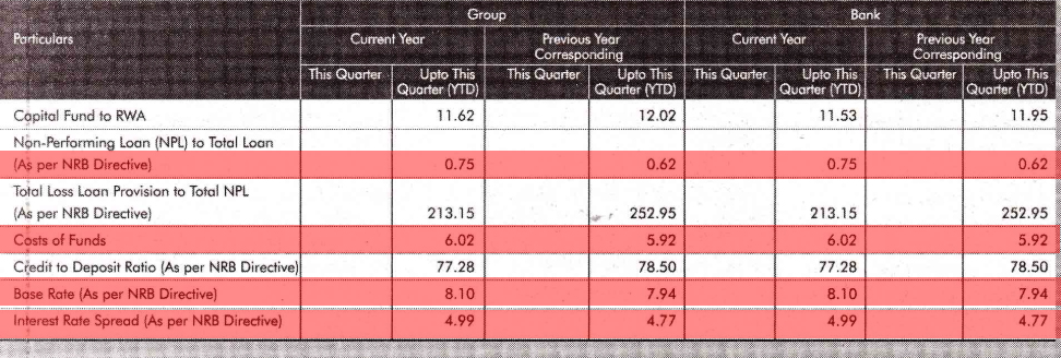दोस्रो त्रैमासिक वित्तीय विवरणमा बैंकको मुनाफा घटेको र खराव कर्जा बढेको देखिएको छ । वित्तीय विवरण अनुसार बैंकले चालु आवको छ महिनामा गत आवको तुनालमा १३ करोड रुपैयाँ मुनाफा घटेर दुई अर्ब ४ करोडमा सीमित हुन पुगेको छ । त्यस्तै बैंकको खराव कर्जा पनि बढेको छ । यसअघिको आर्थिक वर्षमा ०.६२ प्रतिशत रहेको बैंकको खराव कर्जा चालु आवको पुस मसान्त सम्ममा ०.७५ पुगेको छ ।
