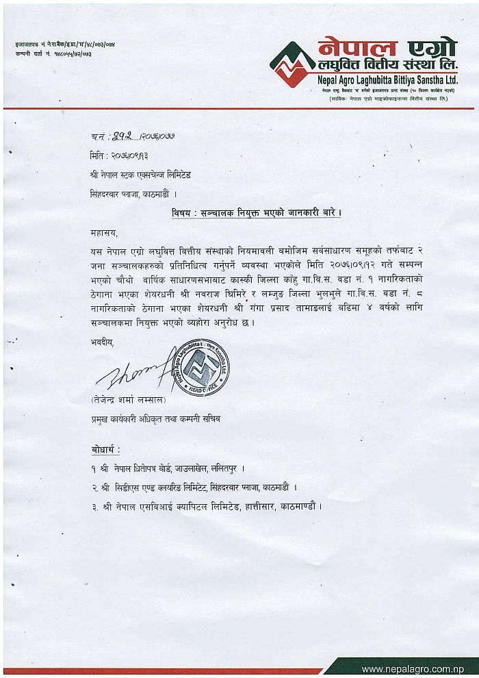 काठमाडौं । नेपाल एग्रो लघुवित्त वित्तीय संस्था लिमिटेडको संचालकमा नवराज घिमिरे र गंगा प्रसाद तामाङ नियुक्त भएका छन् । सर्वसाधारण समूहको तर्फबाट प्रतिनिधित्व गर्न कम्पनीले संचालक पदमा २ जना नियुक्त गरेको जनाएको छ ।