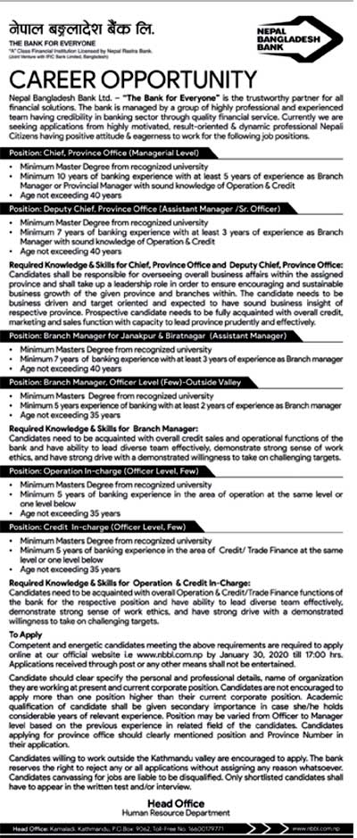 बैंकले उपत्यका बाहिरका विभिन्न शाखा कार्यालयका लागि उल्लेखित कर्मचारीको माग गरेको जनाएको छ । ईच्छुक तथा योग्यता पुगेकाले ३० जनवरीसम्म आवेदन दिन सक्ने जनाएको छ ।