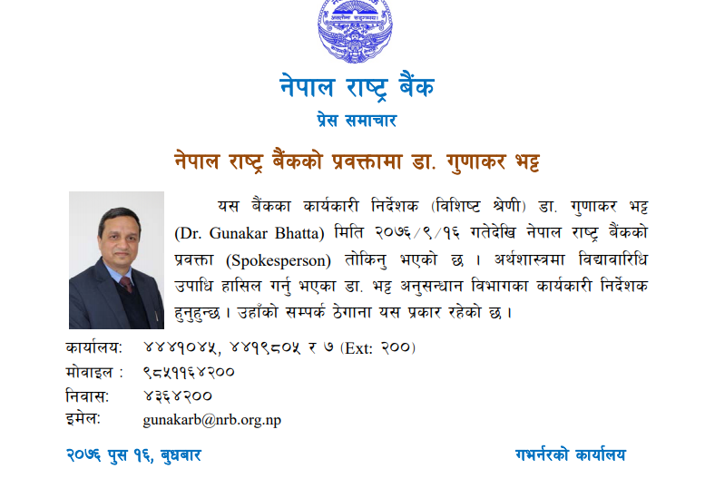 काठमाडौँ । नेपाल राष्ट्र बैंकका प्रवक्तामा डा. गुणाकार भट्ट नियुक्त भएका छन् । बैंकका कार्यकारी निर्देशक (विशिष्ट श्रेणी) मा रहेका भट्टलाई पुष १६ गते प्रवक्तामा नियुक्त गरिएको हो ।