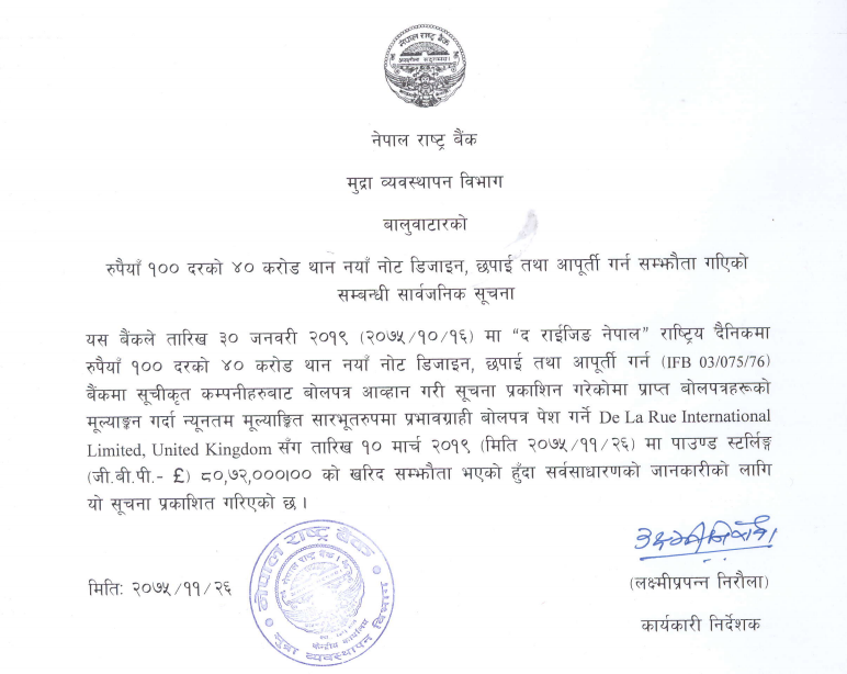 बेलायतको डे ला रुफ इन्टरनेशनल कम्पनीसँग १०० दरका नयाँ नोट छाप्ने र आपूर्ति गर्ने सम्झौता भएको हो ।बेलायती कम्पनीले ८० लाख ७२ हजार पाउण्डमा नोट छपाई र आपूर्तिको जिम्मा पाएको हो ।