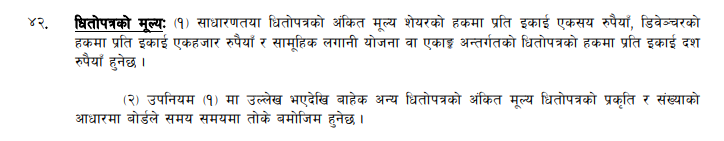 त्यस्तै धितोपत्र दर्ता तथा निष्काशन नियमावली २०७३ को दफा ४२ मा साधारणतया धितोपत्रको अंकित मूल्य शेयरको हकमा प्रति इकाई एक सय रुपैयाँ, डिवेञ्चरको हकमा प्रति इकाई एक हजार रुपैयाँ र सामूहिक लगानी योजना वा एकाङ्क अन्तर्गतको धितोपत्रको हकमा प्रति इकाई दश रुपैयाँ हुनेछ भन्ने व्यवस्था छ। यसै दफाको उपदफा २ मा धितोपत्रको अंकित मूल्य धितोपत्रको प्रकृति र संख्याको आधारमा बोर्डले समय समयमा तोके बमोजिम हुनेछ भनिएको छ।
