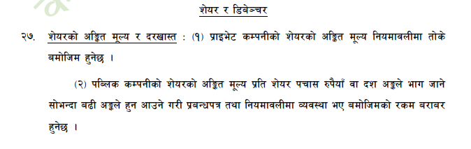 कम्पनी ऐनमा पब्लिक कम्पनीको शेयरको अंकित मूल्य प्रति शेयर ५० रुपैयाँ वा दश अंकले भाग जाने सो भन्दा बढि अंकले हुन आउने गरि प्रबन्धपत्र तथा नियमावलीमा व्यवस्था भए बमोजिमको रकम बराबर हुनेछ भन्ने व्यवस्था छ। यसका लागि कम्पनीले अहिलेको प्रवन्धपत्रलाई संसोधन गर्नु पर्ने हुन्छ।
