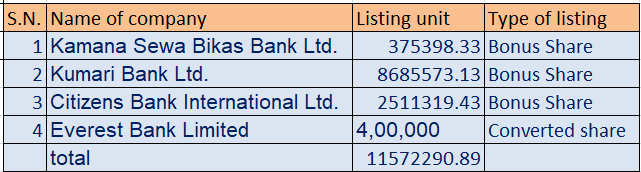 जसमा सिटिजन्स बैंकको २५ लाख ११ हजार ३ सय १९ दशमलव ४३ कित्ता बोनस शेयर र कुमारी बैंकको ८६ लाख ८५ हजार ५ सय ७३ दशमलव १३ कित्ता बोनश शेयर सुचिकृत भएको हो ।