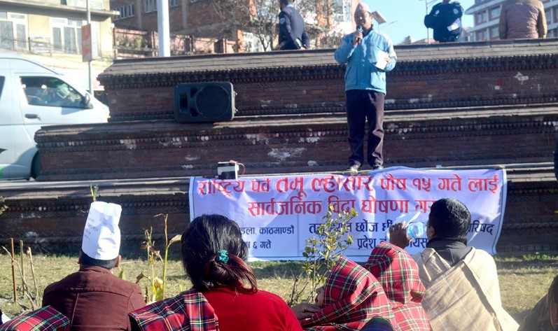 काठमाडौं । तमु ल्होसारमा माईतीघरमा सार्वजनिक बिदा दिनुपर्छ भन्दै माईतीघरमा प्रदर्शन गरेको छ । आईतबार माइतीघर मण्डलमा पुस १५ गते सावजनिक बिदा दिन माग गर्दै प्रदर्शन गरेका हो ।यस अघि आदिवासी जनजाति समुदायले आफूहरुको चाडपर्वमा राष्ट्रिय विदा दिन माग गर्दै गत साता माइतीघरमा प्रर्दशन गरेको थियो ।