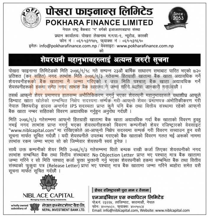 फाइनान्सको गत पुस १८ गते सम्पन्न २३ औँ वार्षिक साधारण सभाबाट ७.२० प्रतिशत नगद लाभांश र ७ प्रतिशत बोनस शेयर वितरण गर्ने प्रस्ताव पारित गरेको थियो । फाइनान्सले सोही नगद लाभांश हितग्राही खातामा बैंक खाता अद्यावधिक गराएका शेयरधनीहरुको बैंक खातामा सो लाभांश जम्मा गरेको जनाएको छ ।