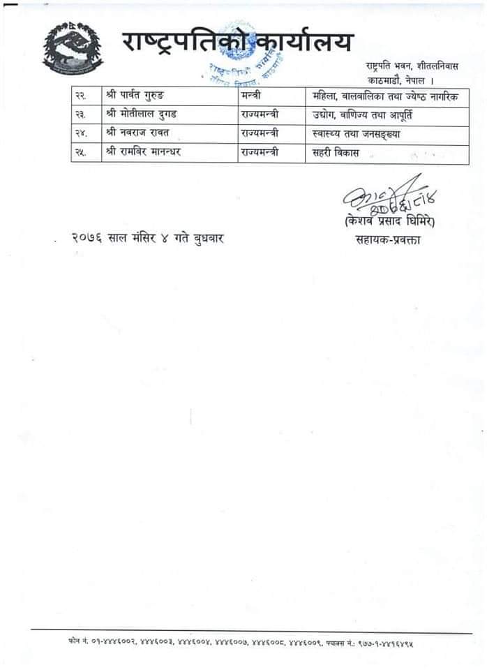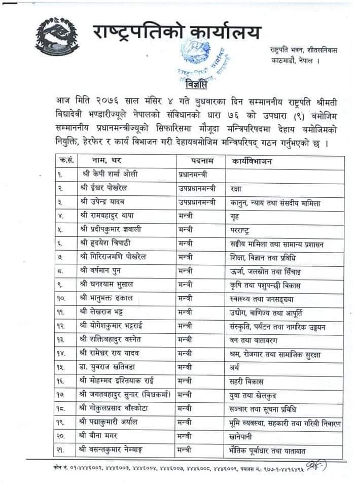 राष्ट्रपति कार्यालयबाट जारी सूचना अनुसार मन्त्रिपरिषदकाे विवरण यसप्रकार छ ।