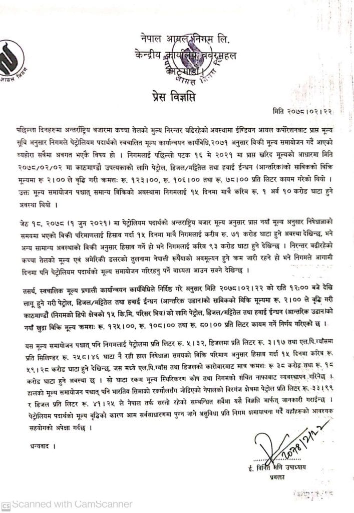 मूल्य वृद्धिपछि काठमाडौं उपत्यकामा पेट्रोलको मूल्य प्रतिलिटर १२५, डिजल तथा मट्टीतेलको १०८ र हवाई इन्धन आन्तरिकतर्फको मूल्य प्रतिलिटर ८० रुपैयाँ पुगेको निगमले जनाएको छ ।