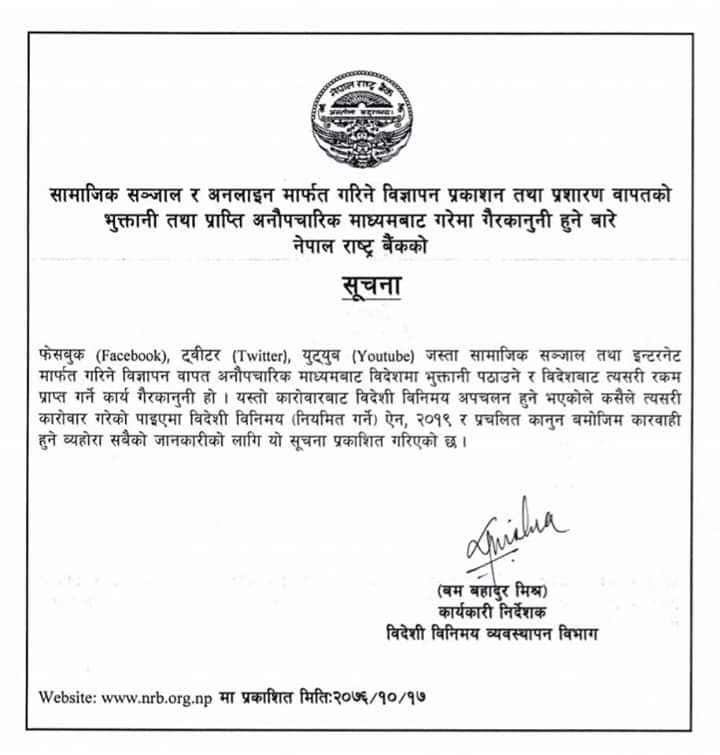 नेपाल राष्ट्र बैंकका विदेशी विनिमय व्यवस्थापन विभागका कार्यकारी निर्देशक बम बहादुर मिश्रले शुक्रबार एक सूचना जारी गर्दै सामाजिक सञ्जाल, फेसबुक, ट्वीटर र युट्युवसहितका अनलाईनका माध्यमबाट गरिने विज्ञापनलाई कानुनी दायराभित्र रहेर काम गर्न भनेका छन् । मिश्रद्वारा जारी सूचनामा औपचारिक सरकारी च्यानल प्रयोग नगरी अनलाईनमा विज्ञापन कारोबारबापत लेनदेन गरेको पाएमा विदेशी विनिमय ऐन २०१९ बमाजिम कारवाही हुने समेत प्रष्ट पारेका छन् ।