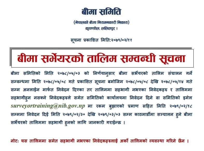 उक्त समयमा तालिममा सहभागी हुन नसकेका निवेदकले समितिको कार्यालयमा निवेदन दिने वा साितिको इमेलमा रकम बुझाएको प्रमाण सहित २०७९ जेठ १८ गतेसम्ममा निवेदन दिइ २०७९ जेठ ३० गतेदेखि असार ३ गतेसम्म काठमाडौंमा संचालन हुने बीमा सर्भेयरको तालिममा सहभागी हुन समितिले आग्रह गरेको छ ।