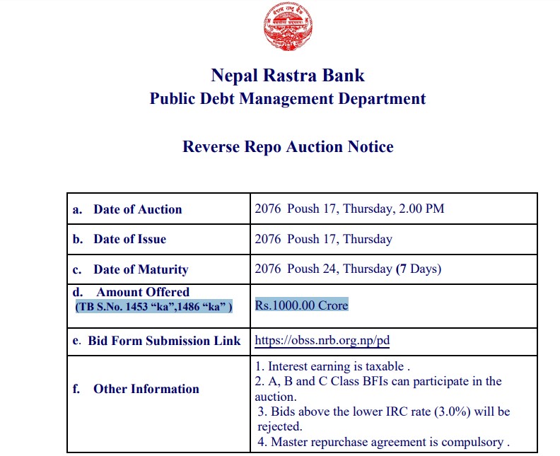 भोलिका लागि जारी गर्न लागिएको रिभर्स रिपोमा क, ख र ग बर्गका बैंक तथा वित्तीय संस्थाहरुले भाग लिन पाउनेछन् ।
