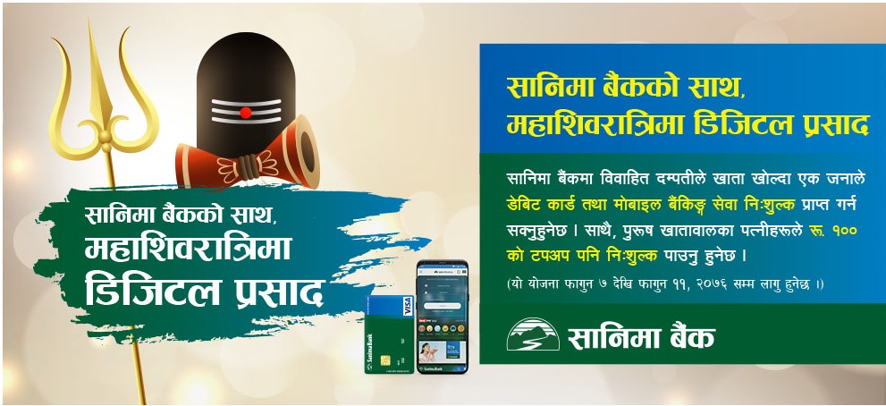काठमाडौं । महाशिवरात्रिको उपलक्ष्यमा सानिमा बैंकले आफ्ना ग्राहकहरुलाई विशेष योजना स्वरुप विभिन्न छुट प्रदान गर्ने भएको छ ।