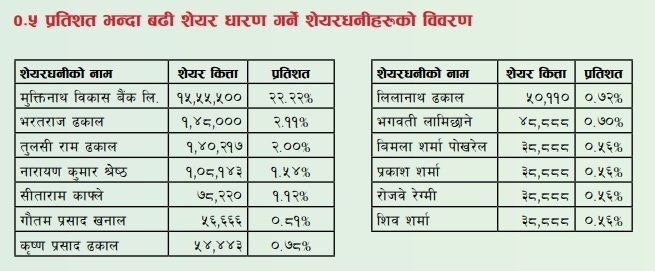 ढकालविरुद्ध कारबाहीका लागि गुनासो आएपछि धितोपत्र बोर्डकै निर्देशनमा ढकालले कृषि कम्पनीको कार्यकारी अध्यक्षबाट राजीनामा दिएका थिए। कार्यकारी अध्यक्ष पद र प्रबन्ध सञ्चालक दुवै कार्यकारी पद हो तर ढकालले सेबोनलाई नै चुनौती दिदै फेरि तलबी पद हत्याउन सफल भए। मुक्तिनाथ कृषि कम्पनीमा मुक्तिनाथ विकास बैंकको २२.२२ प्रतिशत शेयर स्वामित्व छ। संस्थापक शेयरधनीबाट भरतराज ढकालकै सबैभन्दा बढी २.११ प्रतिशत शेयर स्वामित्व कृषि कम्पनीमा रहेको छ।