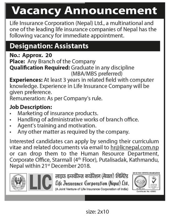 लाइफ इन्स्योरेन्स कर्पोरेशन नेपाल लिमिटेडले सहायक पदका लागि २० जना कर्मचारीको माग गरेको छ ।