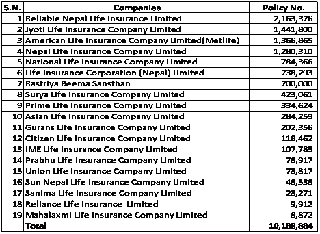 २०७६ चैत्र सम्ममा कायम बीमालेख संख्या १ करोड भन्दा बढी रहेको छ । बीमालेख संख्याको आधारमा रिलायबल नेपाल लाइफमा सवैभन्दा धेरै संख्यामा पोलिसी कायम रहेको देखिन्छ । यसले बैदेशिक रोजगार बीमा बीमा पुल मार्फत सञ्चालन हुने भएपनि यसमा समावेश गरिएको जनाएको छ । प्रकाशित विवरण अनुसार ज्योति लाइफ दोश्रो, मेटलाइफ तेश्रो, नेपाल लाइफ चौथो र नेशनल लाइफपाँचौ स्थानमा रहेका छन् ।