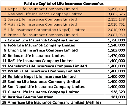 वि.सं. २०७६ चैत्र मसान्तसम्ममा ६ वटा जीवन बीमा व्यवसाय सञ्चालन गर्ने बीमकहरुको मात्र तोकिएको चुक्ता पुँजी पुगेको देखिन्छ । ती कम्पनीहरु नेपाल लाइफ नेशनल लाइफ, सुर्या लाइफ, लाइफ इन्स्योरेन्स कर्पोरेसन, एशियन लाइफ र प्राइम लाइफ हुन् । पुराना कम्पनीहरुमा राष्ट्रिय बीमा संस्थान, र गुराँस लाइफको तोकिएको चुक्ता पुँजी पुगेको छैन भने नयाँ कम्पनीहरुमा कुनैपनि कम्पनीको चुक्ता पुँजी पुगेको छैन ।