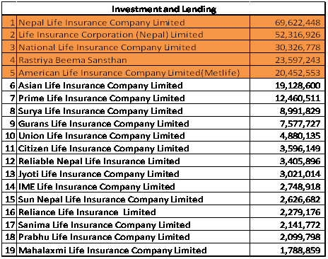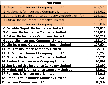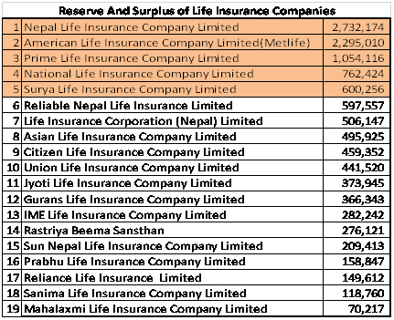 १९ वटा जीवन बीमा सेवा प्रदायकहरुको जगेडा तथा कोष विश्लेषण गर्दा नेपाल लाइफ, मेटलाइफ, प्राइम लाइफ, नेशलन लाइफ र सूर्या लाइफ क्रमश्ः पहिलो, दोश्रो, तेश्रो, चौथो र पाँचौ स्थानमा रहेका छन् । नम्वरमा पर्दछ ।