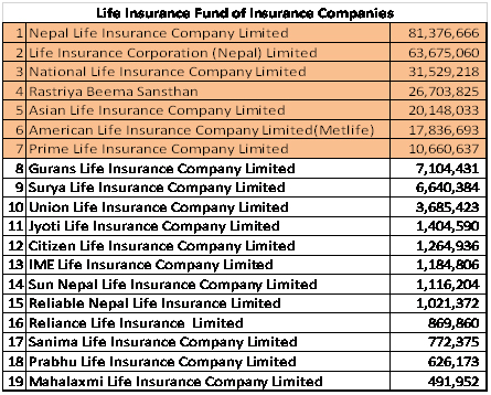 वि.सं. २०७६ चैत्र मसान्त सम्ममा नेपालमा सञ्चालित जीवन बीमा प्रदायकहरुको जीवन बीमा कोष २ खरब ७८ अरब ११ करोड रहेको छ । जीवन बीमा कोषको सन्दर्भमा प्रथम देखि पाँचौ स्थान सम्म क्रमशः नेपाल लाइफ, एल.आइ.सी. लेपाल, नेशनल लाइफ, राष्ट्रिय बीमा संस्थान र एशियन लाइफ इन्स्योरेन्स रहेका छन् ।