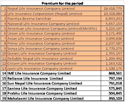 मथि उल्लेखित अवधिमा जीवन बीमा कम्पनीहरुले रु. ६३ अरब ४९ करोड बीमाशुल्क संकलन गरेकोमा रु. १ अरब भन्दा माथि संकलन गर्ने १३ वटा कम्पनी रहेका छन् । बीमा संकलन गर्ने कम्पनीहरुमा नेपाल लाइफ, एलआइसी नेपाल, राष्ट्रिय बीमा संस्थान, नेशनल लाइफ, मेटलाइफ क्रमशः पहिलो, दोश्रो, तश्रो, चौथोर पाँचौ स्थानमा रहेका छन् ।