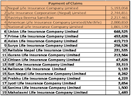 छिटो छरितो र झन्झट रहित दाबी भुक्तानीले बीमकको विश्वसनीयता अभिवृद्दि हुन्छ । बीमा बजारमा बीमकको राम्रो छबि निर्माण हुन्छ । राम्रो छबिले व्यवसाय वृद्दिमा मद्दत गर्दछ । त्यसैले बीमा कम्पनीहरुले दाबी भुक्तानीलाई सहज, सरल र झन्झटबाट मुक्त बनाउनु पर्दछ । दाबी अवधि भुक्तानी दाबी र मृत्यू दाबी जुनसुकै हुन सक्दछ । यसको लागि बीमक सदा तयार रहनु पर्दछ । नेपाली जीवन बीमा सेवा प्रदायकहरुको चालु आ.व. को तेश्रो त्रैमास सम्मको दाबी भुक्तानीको अवस्था निम्न बमोजिम रहेको छ