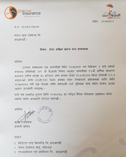 काठमाडौं । शिखर इन्स्योरेन्सले ३० प्रतिशत हकप्रद शेयर बिक्रीका लागि बुक क्लोज मिति तय गरेको छ । कम्पनीले हकप्रद शेयर निष्काशन प्रयोजनका लागि फागुन १३ गते एक दिन शेयरधनी दर्ता पुस्तिका बन्द गर्ने निर्णय गरेको छ ।