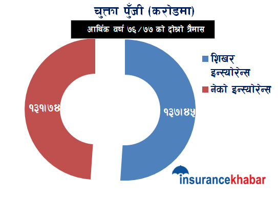 नेको इन्स्योरेन्सको चुक्ता पूँजी १ अर्ब ३१ करोड रहेको छ भने शिखर इन्स्योरेन्सको  चुक्ता पूँजी १ अर्ब ३७ करोड रहेको छ। दोश्रो त्रैमासको वित्तीय प्रतिवेदन अनुसार शिखर इन्स्योरेन्सको चुक्ता पुँजी १ अर्ब ५ करोड भए पनि कम्पनीले ३० प्रतिशत हकप्रद शेयर प्रयोजनार्थ बुक क्लोज गरेकोले उक्त्त हकप्रदलाई पुँजी मा समायोजन गर्दा कम्पनीको पुँजी १ अर्ब ३७ करोड हुन्छ।