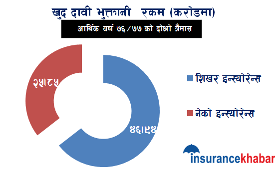 शिखर इन्स्योरेन्सले ८२ करोड ७० लाख कुल दावी भुक्तानी गरेको छ भने ४६ करोड ९४ लाख खुद दावी भुक्तानी गरेको छ। नेको इन्स्योरेन्सले ३८ करोड ६२ लाख कुल दावी भुक्तानी गरेको छ भने २५ करोड ८५ लाख खुद दावी भुक्तानी गरेको छ।