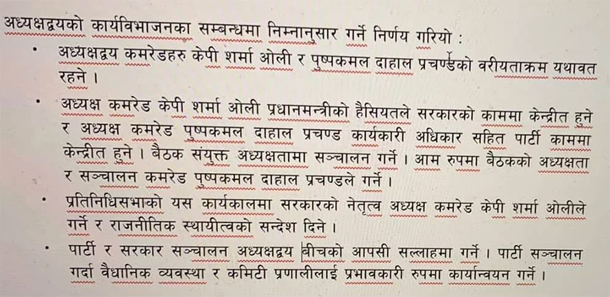राष्ट्रपति विद्यादेवी भण्डारीलाई साक्षी राखेर नेपाल कम्युनिस्ट पार्टी (नेकपा) का दुई अध्यक्ष केपी शर्मा ओली र पुष्पकमल दाहाल प्रचण्डले कार्य विभाजन गर्ने सहमति गरेका छन् । प्रचण्डले प्रम ओलीलाई मात्रै विश्वास नगरेपछि गोप्य रुपमा राष्ट्रपतिसँग बसेर सहमति गरिएको हो । सहमति पत्रमा दुवै अध्यक्षले हस्ताक्षर गरेको स्रोतको दावी छ । सहमति पत्रमा राष्ट्रपति भण्डारीको हस्ताक्षर छ वा छैन भन्ने खुल्न सकेको छैन ।