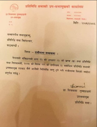 काठमाडौं । प्रतिनिधि सभाकी उपसभामुख डा. शिवमाया तुम्बाहाङफेले आज आफ्नो पदबाट राजिनामा दिएकी छन् ।केहीबेरअघि बसेको संसद बैठकबाटै राजिनामाको घोषणा गरेकी तुम्वाहाम्फेले संवैधानिक रुपमा संकट उत्पन्न हुने अवस्थाका बीच राजिनामा दिएकी हुन् ।