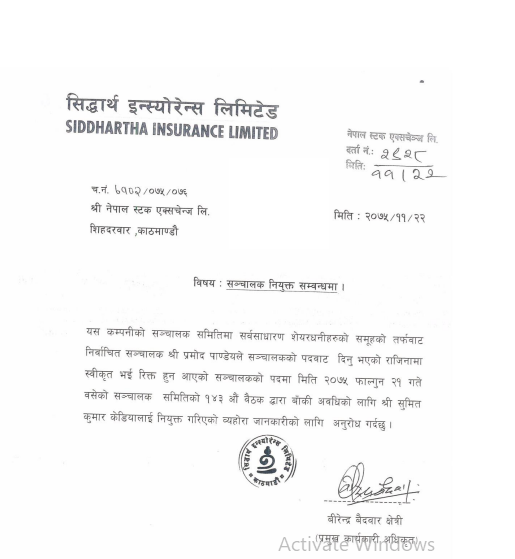 सिद्धार्थ इन्स्योरेन्स कम्पनीले सुमितकुमार केडिया लाई सञ्चालकमा नियुक्त गरेको छ ।