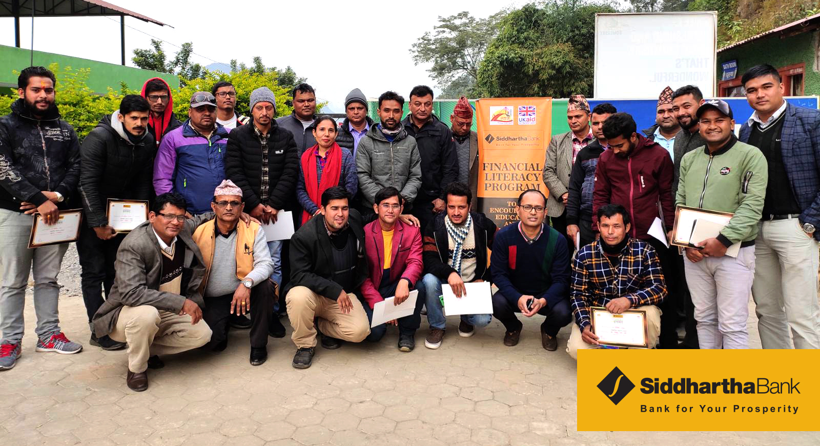 तनहुँ । सिद्धार्थ बैंक लिमिटेडले यूकेएड सक्षम एक्सेस टु फाइनान्सको साझेदारीमा देशका विभिन्न स्थानमा वित्तीय साक्षरता कार्यक्रम सञ्चालन गर्दै आएको छ । बैंकले मंसिर २५ गते दमौलीमा र मंसिर २६ गते दुलेगौडामा वित्तीय साक्षरता कार्यक्रम सम्पन्न गरेको हो ।