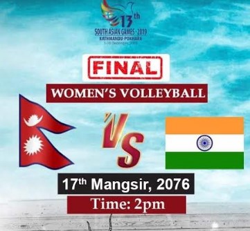 महिला भलिबलको फाईनल खेल नेपाल र भारत विच मंसिर १७ गते दिउँसो २ बजे हुने भएको छ । दशरथ रंगशालाको कवर्डहलमा हुने फाईनल खेल नेपालकै पहिलो स्पोर्टस् च्यानल एक्सन स्पोर्टस् एचडिले प्रत्यक्ष प्रशारण गर्ने भएको छ ।